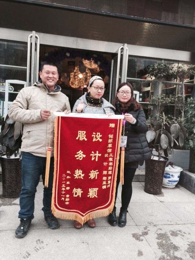 常女士房子基礎(chǔ)裝修在10月份就已經(jīng)面完成,但是銘朗的服務(wù)還沒有就此結(jié)束,由于常女士是位別和藹注重細(xì)節(jié)的業(yè)主,個別主材還是網(wǎng)上訂購,要求殊并嚴(yán)謹(jǐn),銘朗的工作人員給予了大力幫助,解決了很多問題,別是工程部經(jīng)理和管家,把客戶家裝修當(dāng)成自己家裝修,經(jīng)常跑前跑后,從無怨言,設(shè)計(jì)師無不在每個細(xì)節(jié)親自把關(guān),常女士格外感動!在房子交工以后門定制了這面錦旗,用于表達(dá)對銘朗裝飾的感謝之情。